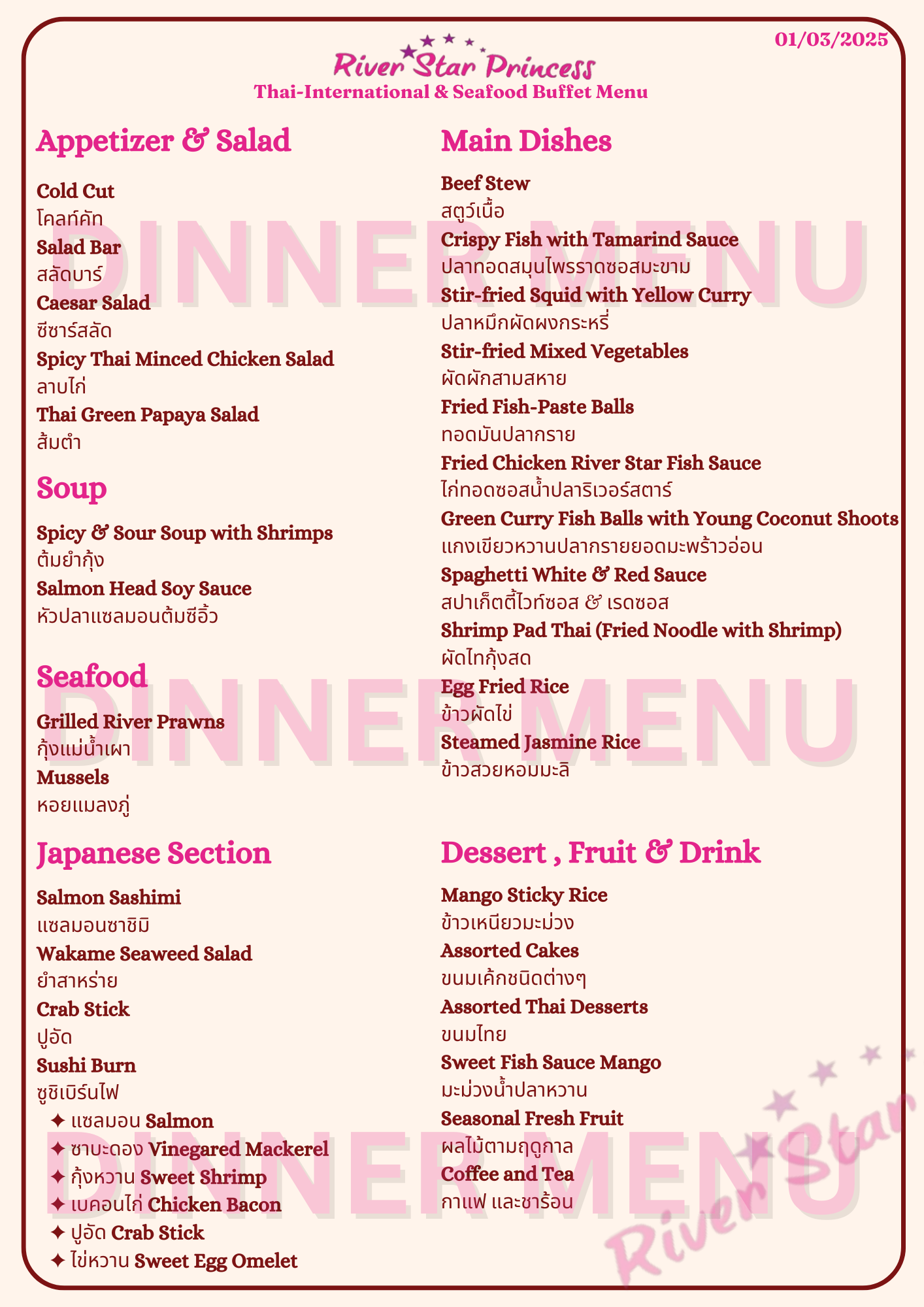 อัตราค่าบริการรวม -อาหาร บุฟเฟต์นานาชาติ ,ซีฟู้ด กุ้ง หอย ออนไอซ์ แซลม่อนซาซิมิ -เครื่องดื่มต้อนรับ ท่านละ 1 แก้ว -การแสดงตามโปรแกรมเรือ -ฟรีน้ำเปล่า ชาร้อน กาแฟร้อน -ฟรี มินิเค้ก ใช้บริการตรงเดือนเกิด หรือวันครบรอบ
